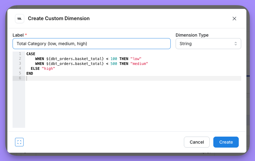 Custom SQL dimensions can query any data from your warehouse, so they should only be created by trusted users (admins and developers). For most cases, it’s safer and more reusable to define dimensions in your dbt files. If you want to make a custom SQL dimension reusable, use the dbt write-back feature to move it into your dbt project.