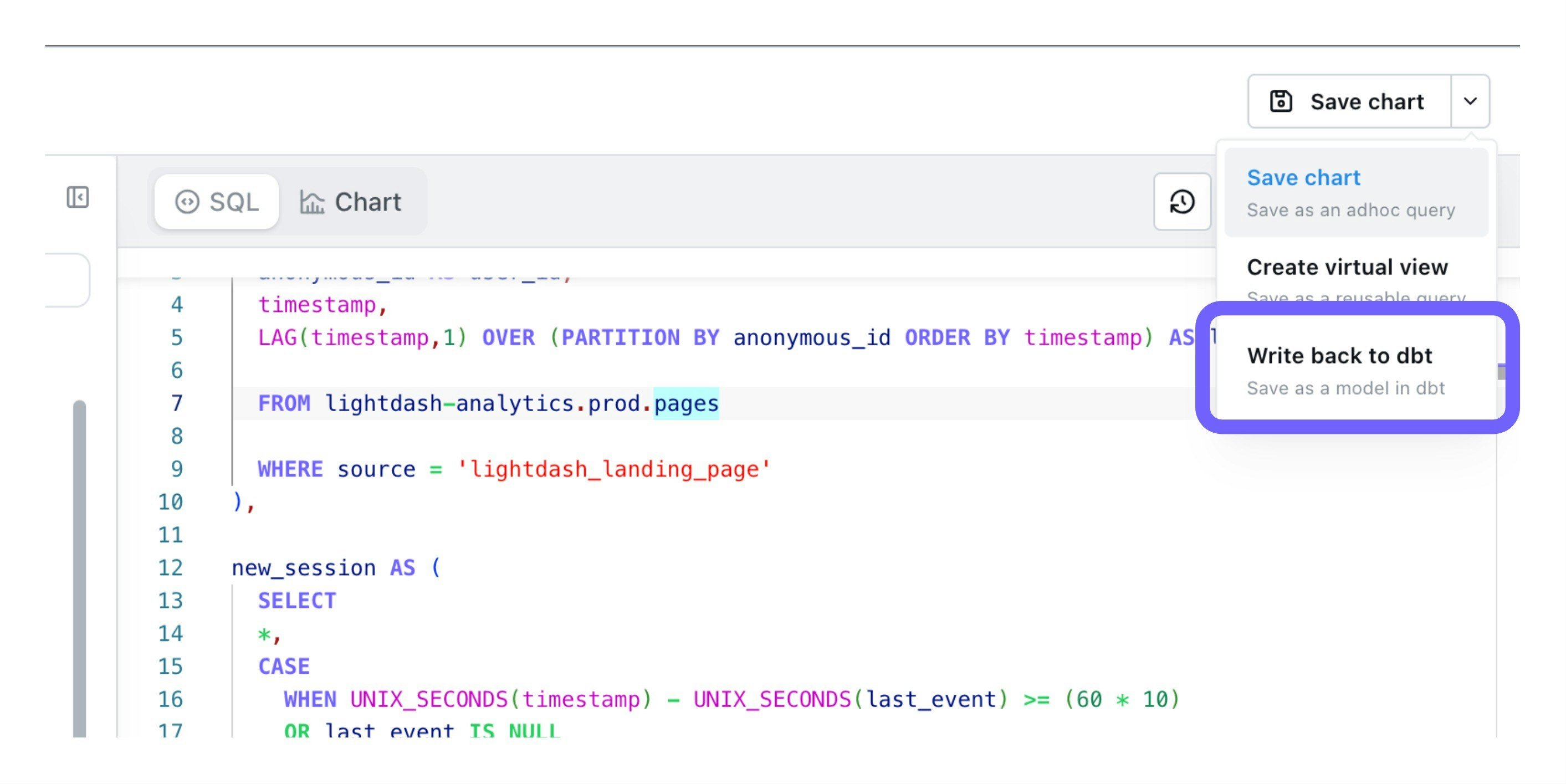You can use Lightdash to build models in dbt from queries that you’ve built in the SQL runner. We recommend writing back models from the SQL runner if you’re planning to use the query regularly so it can be easily used, governed and managed like other dbt models in your Lightdash project. To get started, build and run a query in the SQL runner, then select theWrite back to dbt option from the Save drop-down.
