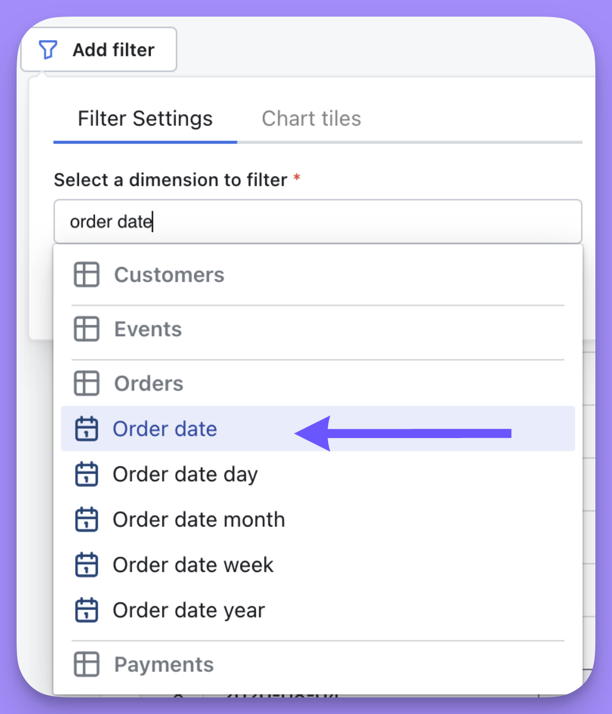 Then, in the Chart tiles tab, you can apply the filter to a SQL chart tile and choose the column you want that filter to apply to. - On a dashboard with only SQL Runner-based tiles, filters are created a little differently since SQL charts are based on columns instead of semantic fields.