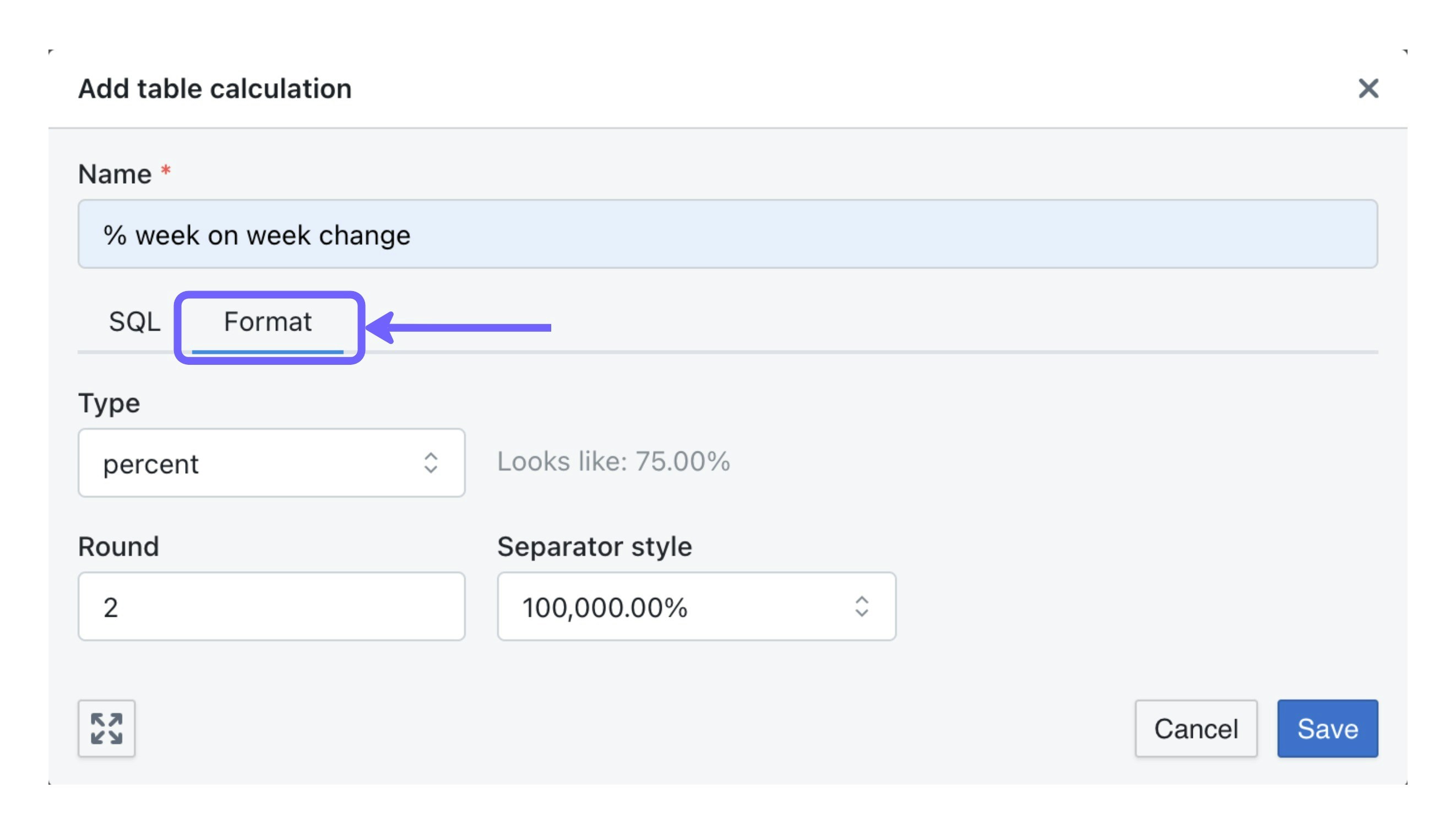 In theformat tab, make sure to update the format to percent so that your table calculation is shown as a percentage value (instead of a number).