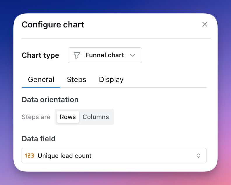 When columns is selected, you should have a numeric column for each step you want to display. Only the first row of data will be represented and the column names will be used as the step labels. Non-numeric columns will be ignored.