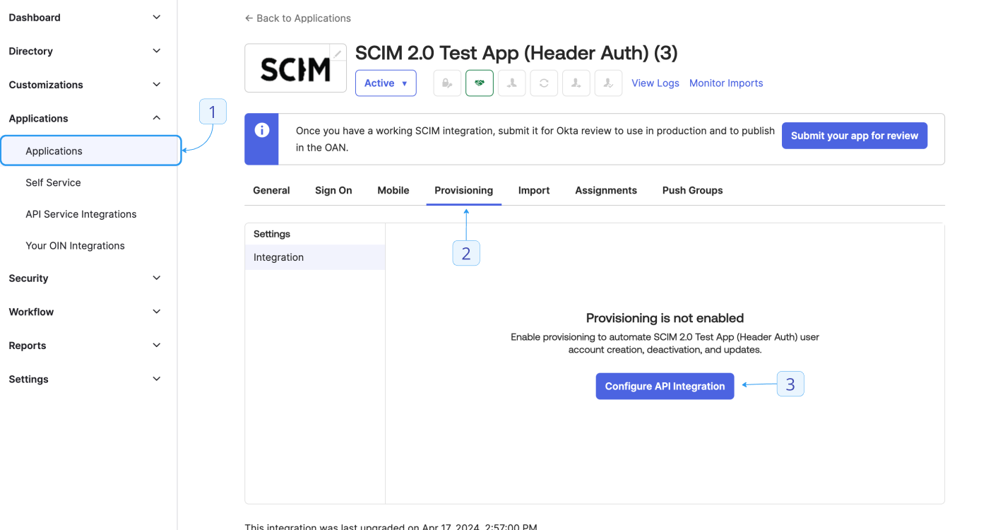 - Select your application and go to the Provisioning tab.